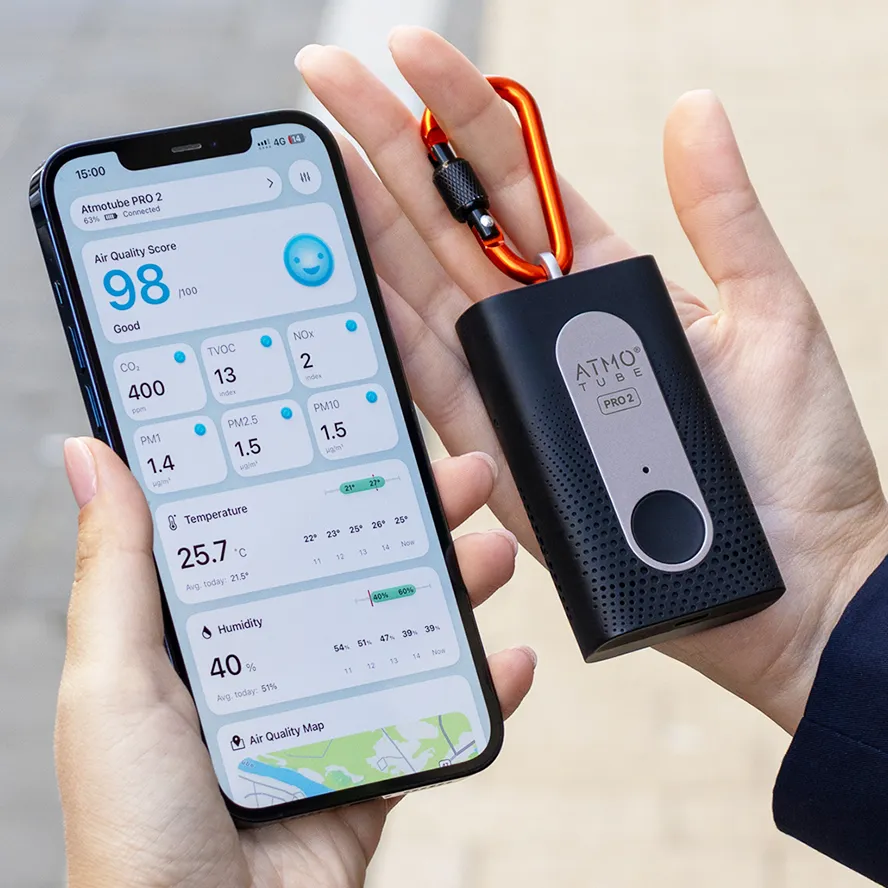 Respire de forma mais inteligente com o Atmotube PRO 2, o monitor de qualidade do ar hiperlocal de última geração, concebido para o ajudar a compreender e proteger a sua saúde onde quer que vá. Ele monitoriza continuamente o ar à sua volta, detetando CO₂, PM1, PM2,5, PM10, NOx, COV, temperatura e humidade.